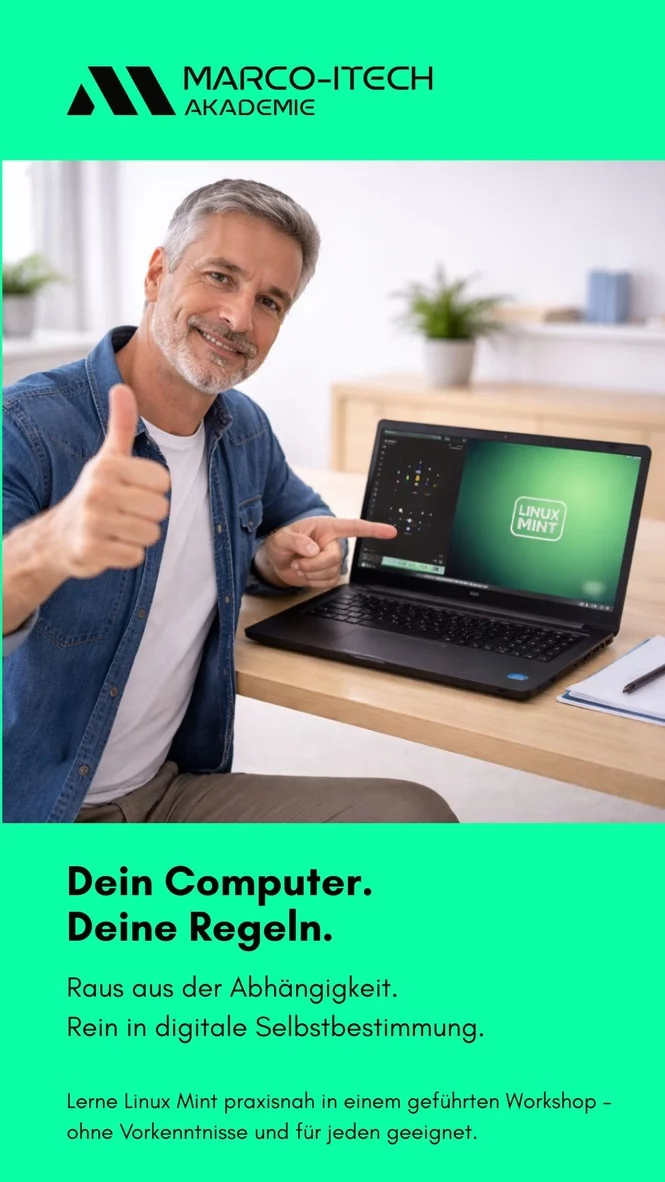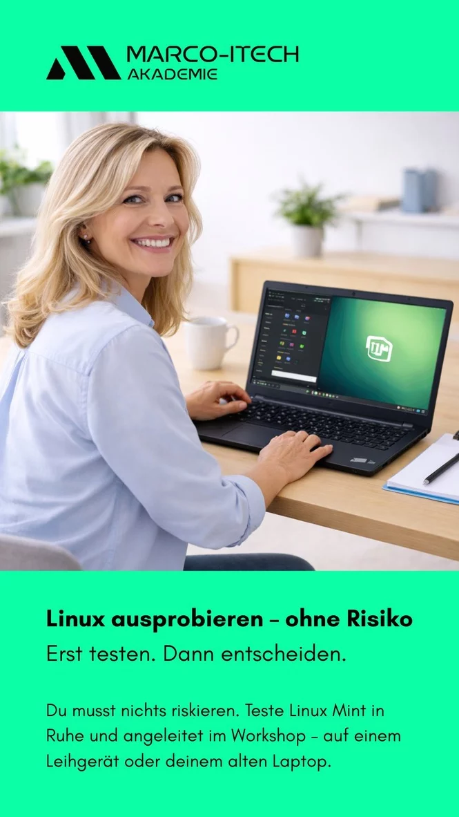 Ideal für alle, die nur ein einziges Gerät besitzen, kein Risiko eingehen möchten oder Linux Mint zunächst in Ruhe angeleitet testen wollen. So kannst du den kompletten Workshop praxisnah mitmachen – ganz ohne Druck.
